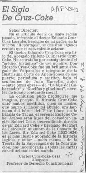El siglo de Cruz-Coke [artículo] Carlos Cruz-Coke Ossa.