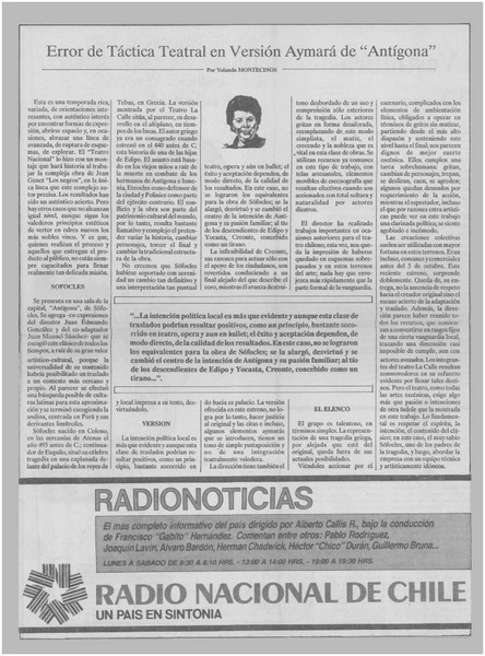 Error de táctica teatral en versión Aymará de "Antígona" [artículo] Yolanda Montecinos.