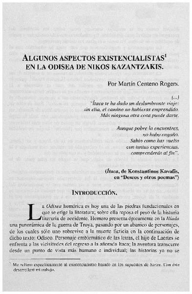 Autores chilenos - Autores griegos - Kazantzakis, Nikos - Centeno Rogers, Martín - Algunos aspectos existencialistas en la Odisea de Nikos Kazantzakis - Odiea