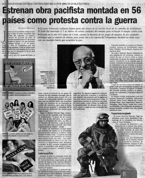 Estrenan obra pacifista montada en 56 países comoprotesta contra la guerra [artículo] Rodrigo Miranda C.