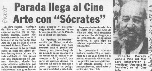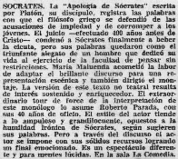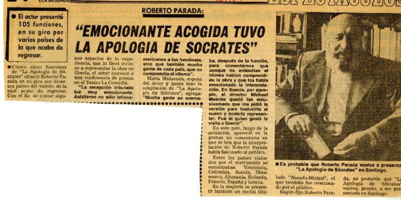 La apología de Sócrates" presentó con éxito Roberto Parada en París. [artículo]