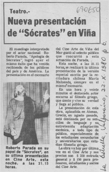 Nueva presentación de "Sócrates" en Viña. [artículo]