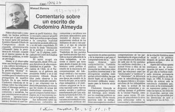 Comentario sobre un escrito de Clodomiro Almeyda [artículo] Manuel Barrera.