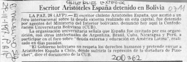 Escritor Aristóteles España detenido en Bolivia [artículo].