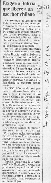 Exigen a Bolivia que libere a un escritor chileno [artículo].