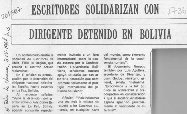 Escritores solidarizan con dirigente detenido en Bolivia [artículo].