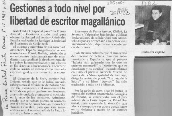Gestiones a todo nivel por libertad de escritor magallánico [artículo]