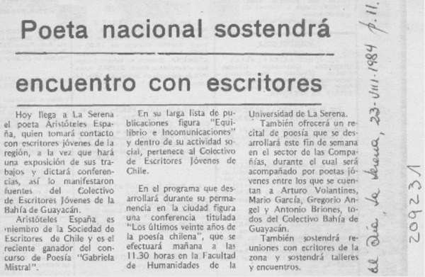 Poeta nacional sostendrá encuentro con escritores [artículo].