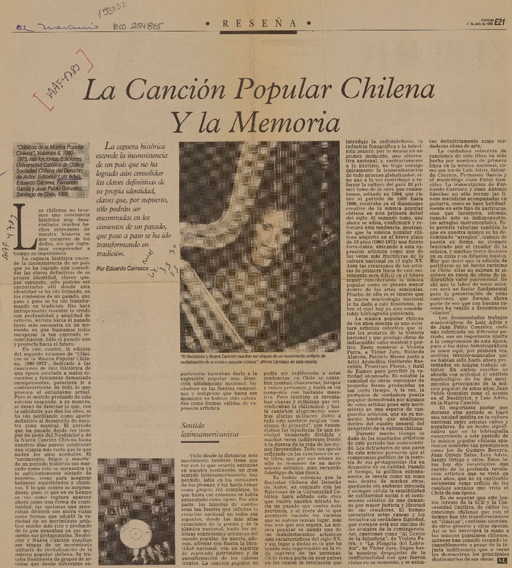 La canción popular chilena y la memoria [artículo] Eduardo Carrasco.
