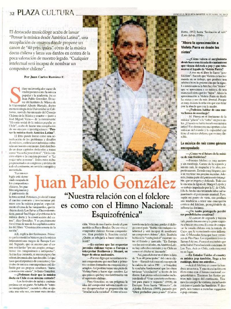 Juan Pablo González : "Nuestra relación con el folclore es como con el himno nacional:esquizofrénica" [entrevista] [artículo] : Juan Carlos Ramírez F.