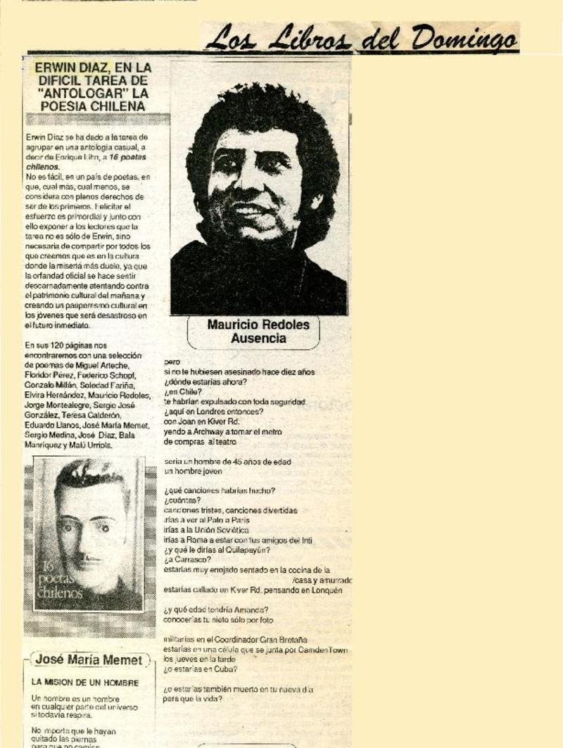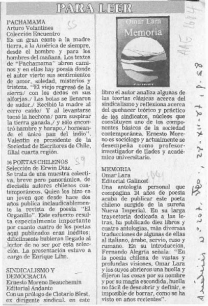 Volantines, Arturo - LARA, OMAR - DIAZ, ERWIN - 16 POETAS CHILENOS - MORENO BEAUCHEMIN, ERNESTO - MEMORIA - SINDICALISMO Y DEMOCRACIA - Pachamama