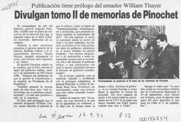 Presentan segundo tomo de las memorias de Pinochet [artículo].