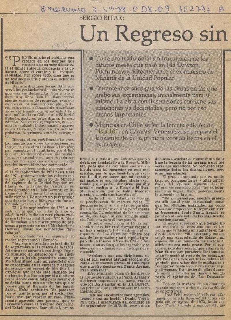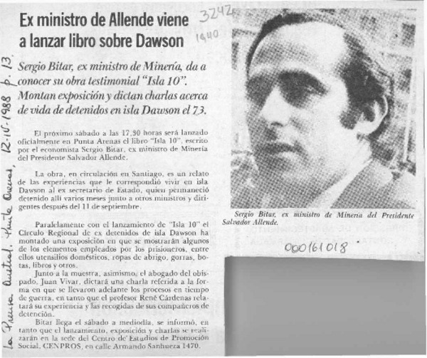 Ex ministro de Allende viene a lanzar libro sobre Dawson [artículo].