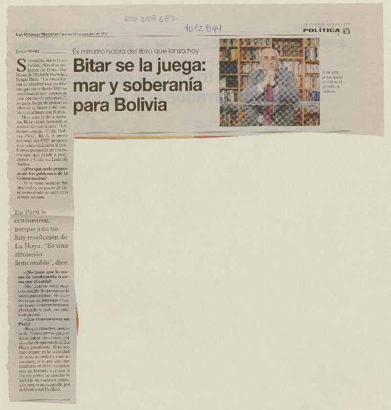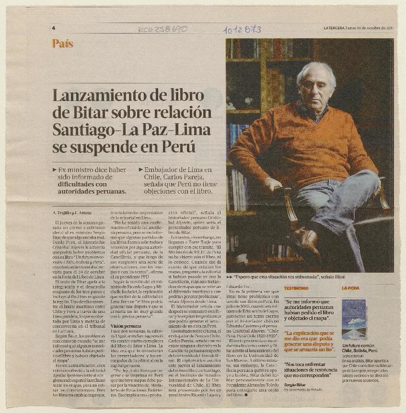 Lanzamiento de libro de Bitar sobre relación Santiago-La Paz-Lima se suspende en Perú [artículo] A. trujillo y F. Artaza.