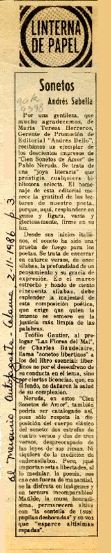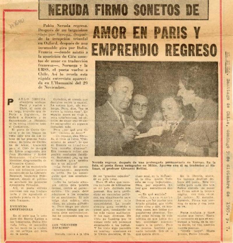 Neruda firmo sonetos de amor en Paris y emprendio regreso [artículo]