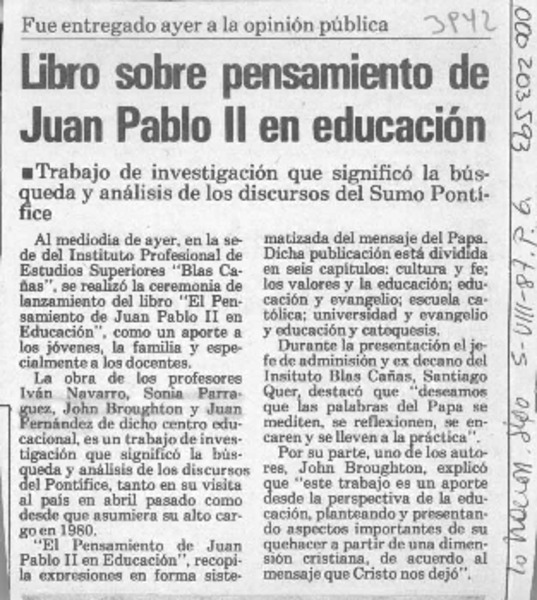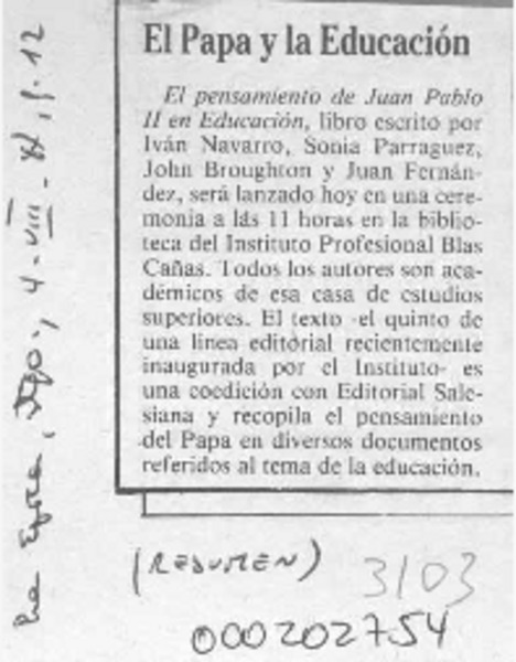 Libro sobre pensamiento de Juan Pablo II en educación [artículo].