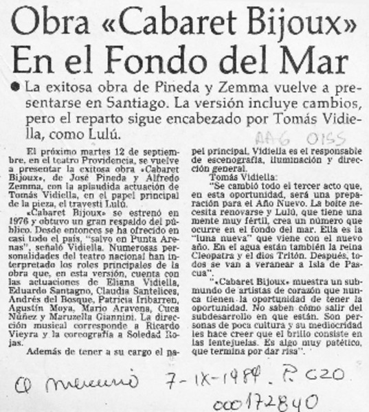 "Cabaret Bijoux" en versión '89 un submundo de fracasos y sueños [artículo] Yolanda Montecinos.