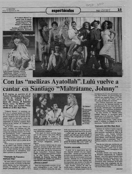 Con las "mellizas Ayatollah", Lulú vuelve a cantar en Santiago "Maltrátame, Johnny" [artículo] A. L. A.