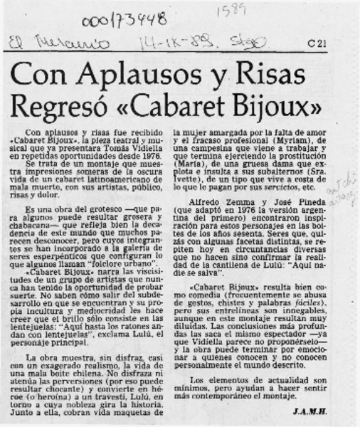Con aplausos y risas regresó "Cabaret Bijoux" [artículo] J. A. M. H.
