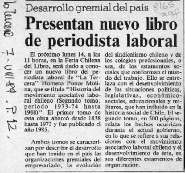 PONCE MOLINA, HOMERO - HISTORIA DEL MOVIMIENTO ASOCIATIVO LABORAL CHILENO