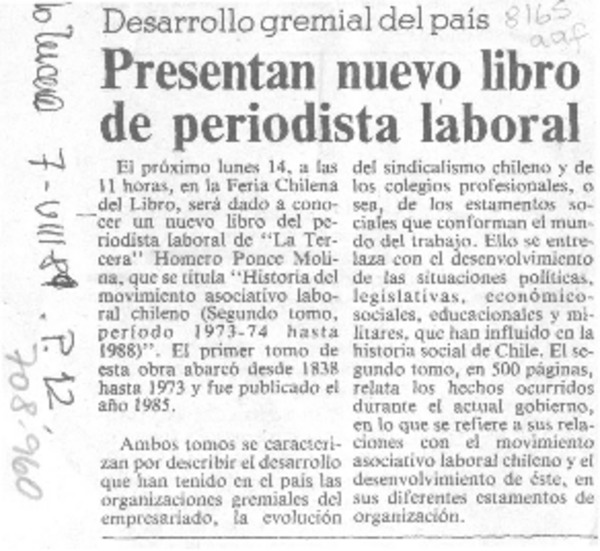 Presentan nuevo libro de periodista laboral. [artículo]