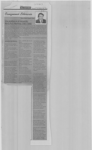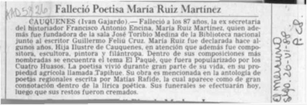 Falleció poetisa María Ruiz Martínez [artículo].