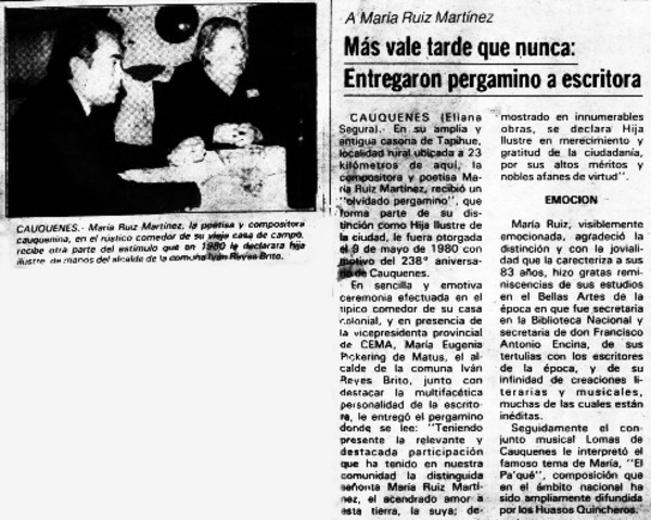 Evocaron a poeta María Ruiz, en Tapihue [artículo].
