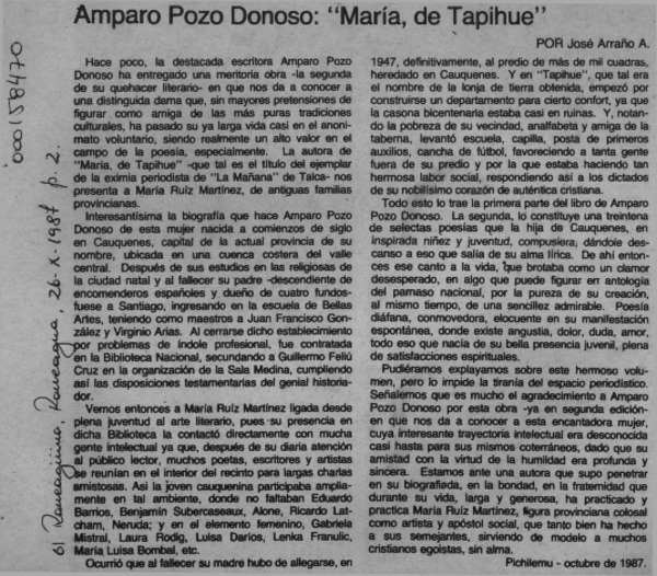 Amparo Pozo Donoso, "María, de Tapihue" [artículo] José Arraño Acevedo.
