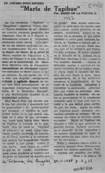 "María de Tapihue" [artículo] Darío de la Fuente D.