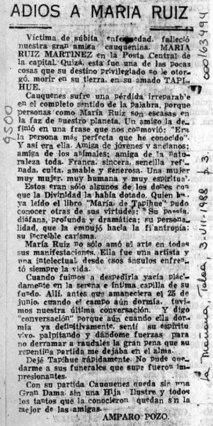 Adiós a María Ruiz [artículo] Amparo Pozo.