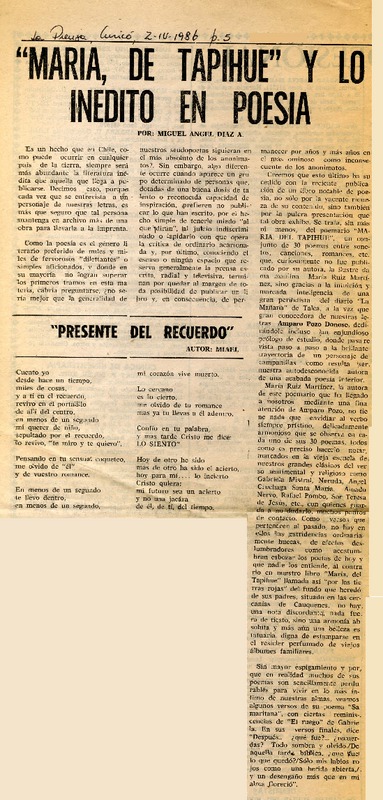 "María, de Tapihue" y lo inédito en poesía [artículo] Miguel Angel Díaz.