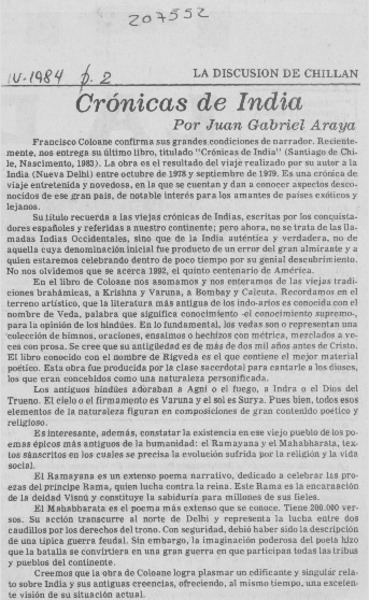 "Crónicas de India" [artículo] Juan Gabriel Araya.