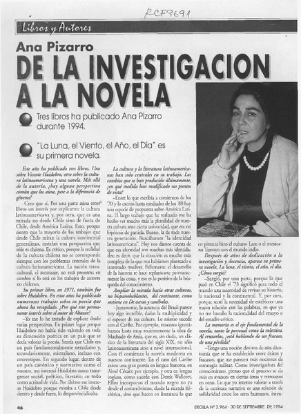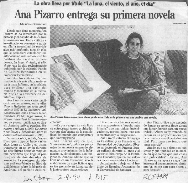 Ana Pizarro entrega su primera novela [artículo] Marcela Giemináni.