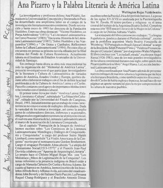 Ana Pizarro y la palabra literaria de América Latina [artículo] Wellington Rojas Valdebenito.