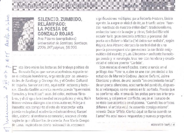 Autoras chilenas - Pizarro, Ana - Rojas, Gonzalo - Autores chilenos - Silencio, zumbido, relámpago