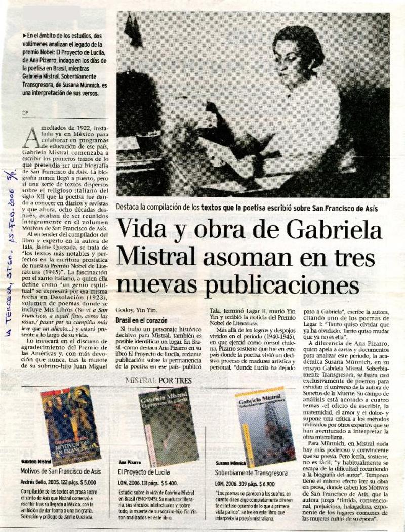 Autoras chilenas - Mistral, Gabriela - Pizarro, Ana - Munnich, Susana - Gabriela Mistral, soberbiamente transgresora - Gabriela Mistral : el proyecto de Lucila - Motivos de San Francisco de Asís