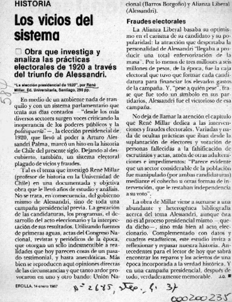 MILLAR CARVACHO, RENE - ELECCION PRESIDENCIAL DE 1920, LA