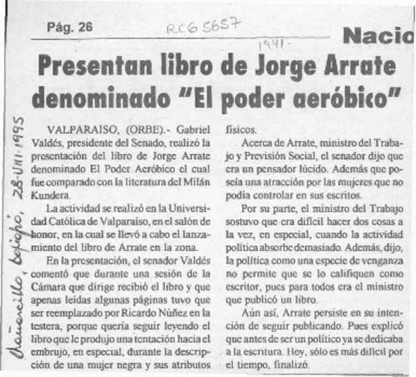 Presentan libro de Jorge Arrate denominado "El poder aeróbico" [artículo].