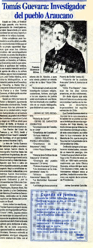 Tomás Guevara, investigador del pueblo araucano [artículo] Jaime González Colville.