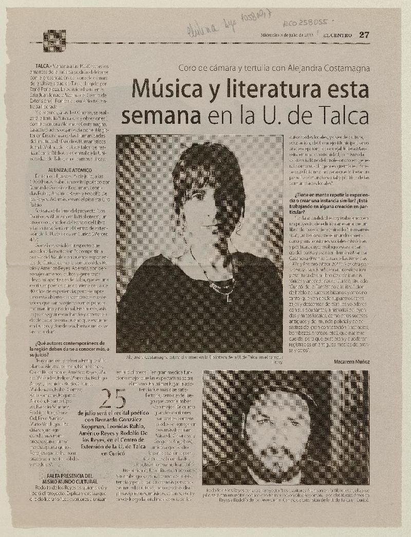 Música y literatura esta semana en la U. de Talca (entrevista) [artículo] Macarena Muñoz.
