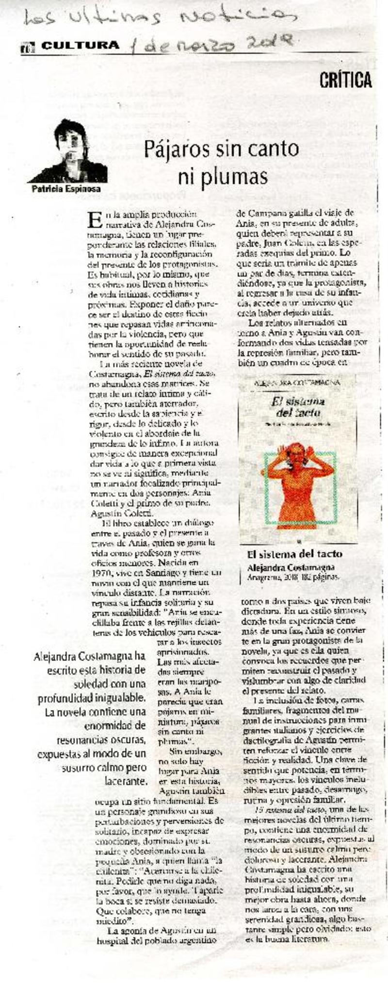 Pájaros sin canto ni plumas [artículo] Patricia Espinosa.