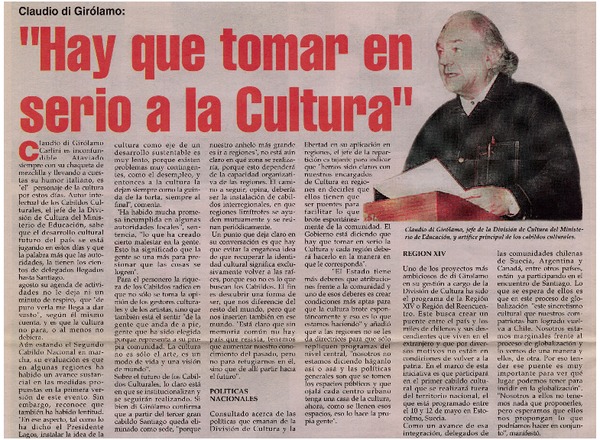 Hay que tomar en serio a la cultura" [artículo] Marta Zúñiga Gatica.