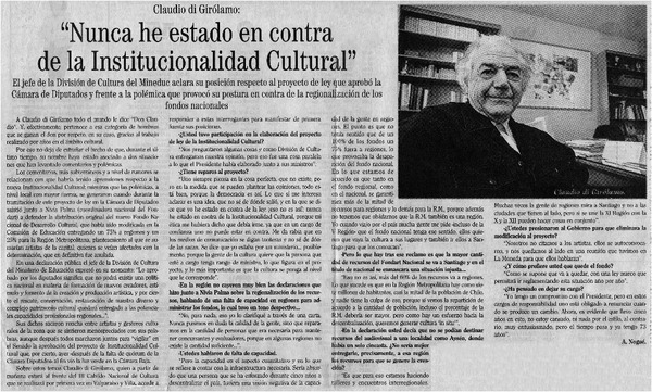 "Nunca he estado en contra de la Institucionalidad Cultural" [entrevista]. [artículo] ; A. Nogué.