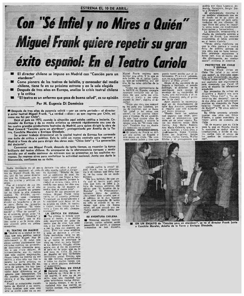 Con "Sé infiel y no mires a quién" Miguel Frank quiere repetir su gran éxito español, en el Teatro Cariola [artículo] M. Eugenia Di Doménico.