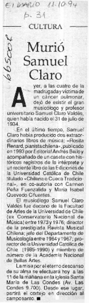Murió Samuel Claro. [artículo]