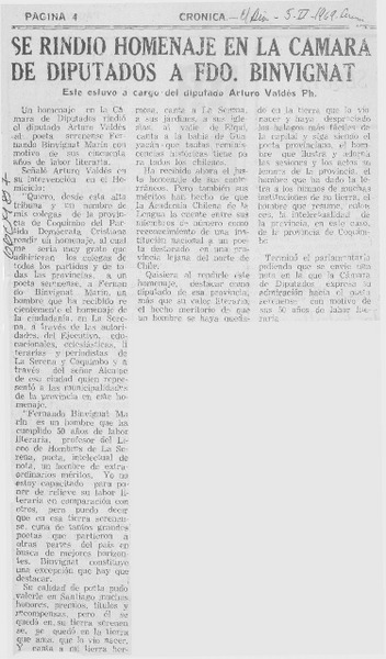 Se rindió homenaje en la cámara de diputados a Fdo. Binvignat [artículo].