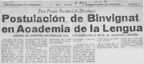 Postulación de Binvignat en Académia de la Lengua. [artículo]