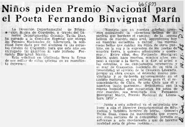 Niños piden Premio Nacional para el poeta Fernando Binvignat Marín. [artículo]