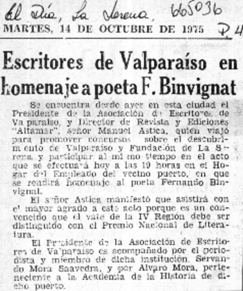 Homenaje al poeta serenense Fernando Binvignat. [artículo]
