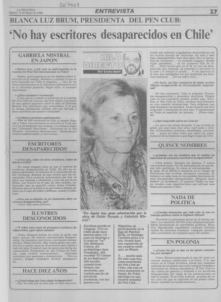 Blanca Luz Brum, presidenta del Pen Club, "No hay escritores desaparecidos en Chile" : [entrevista] [artículo] / Emilio Bakit.